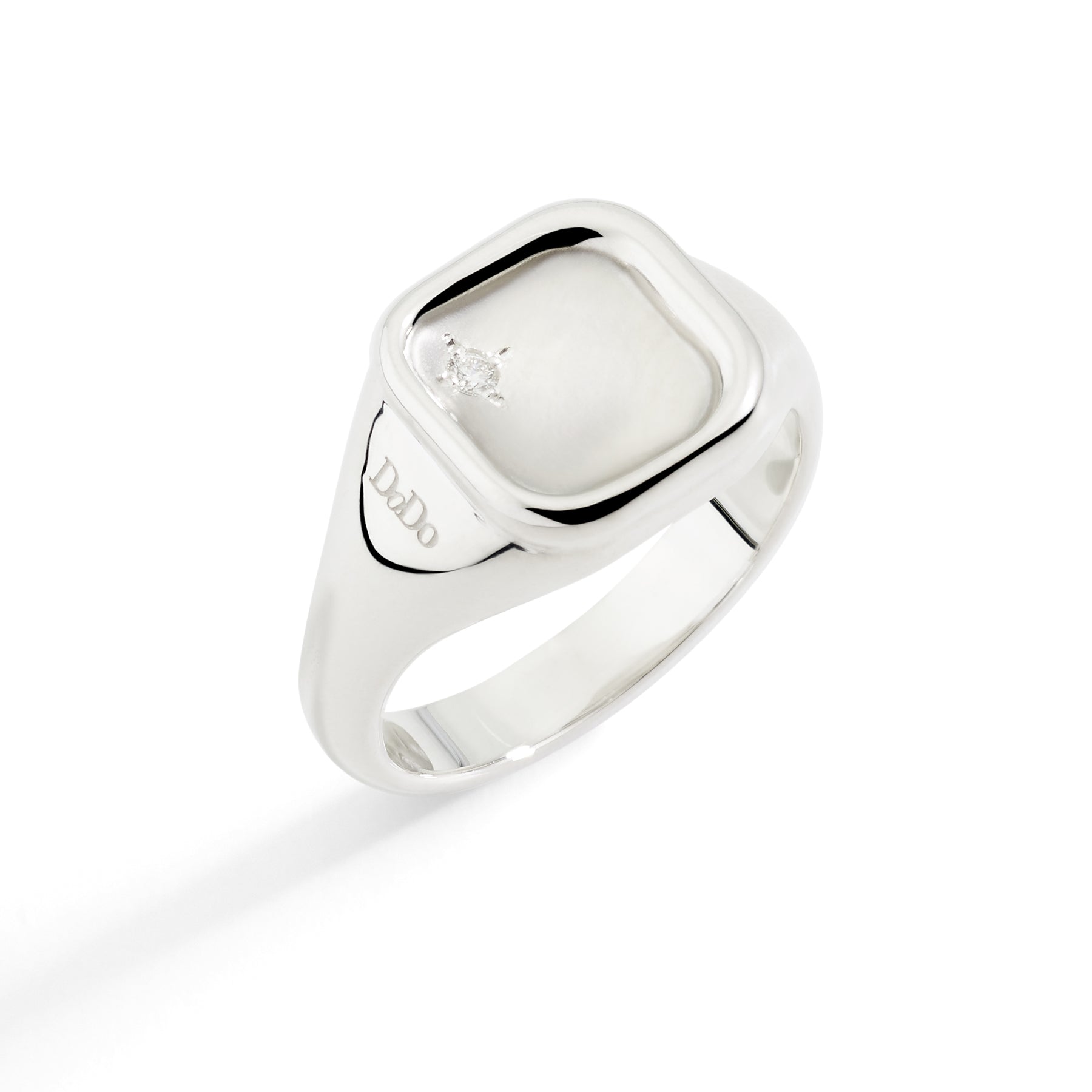 Sigillo celebra il potere del simbolo e della scelta, trasformando il gioiello in uno scrigno di emozioni, ricordi e momenti vissuti. L'anello quadrato, realizzato in argento satinato dalla luce calda e avvolgente, è impreziosito da un raffinato accento di diamante.